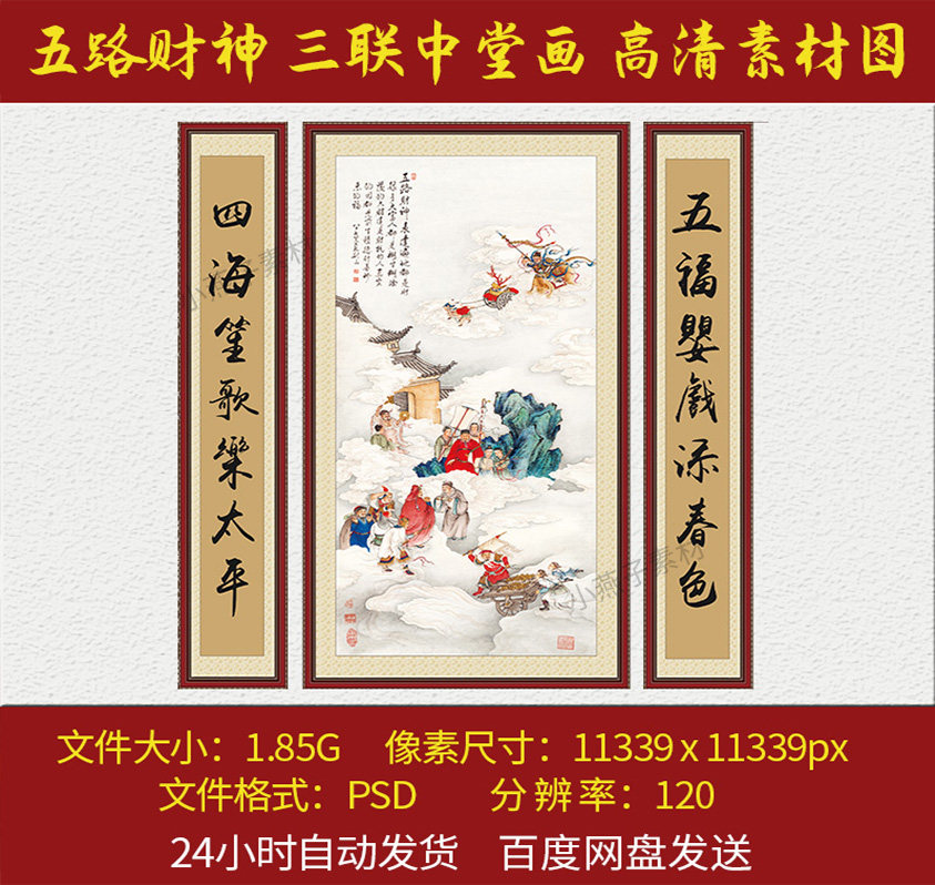 中堂画客厅装饰画素材五路财神挂画中式对联字画高清分层设计图画热门设计联盟服务商